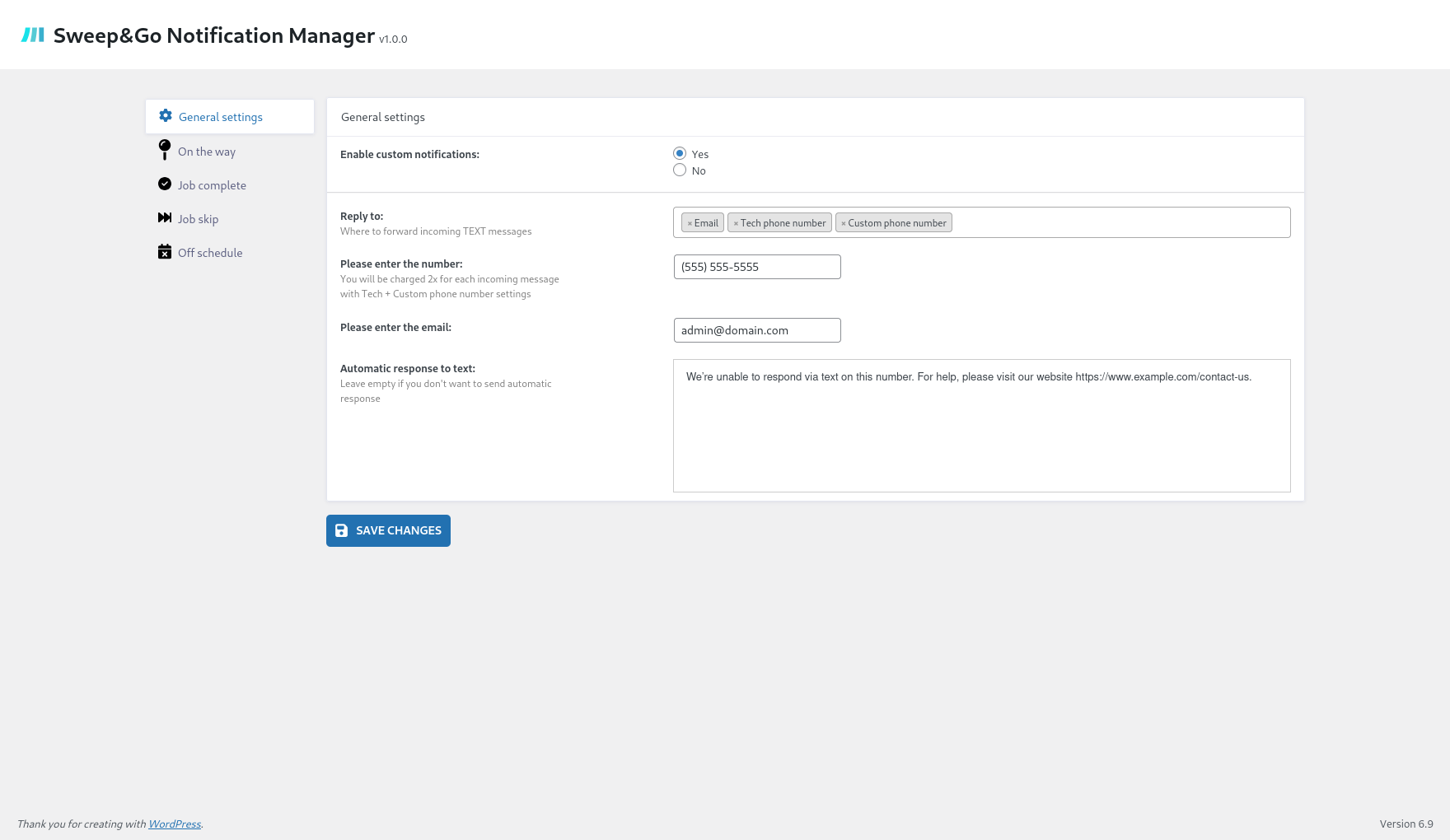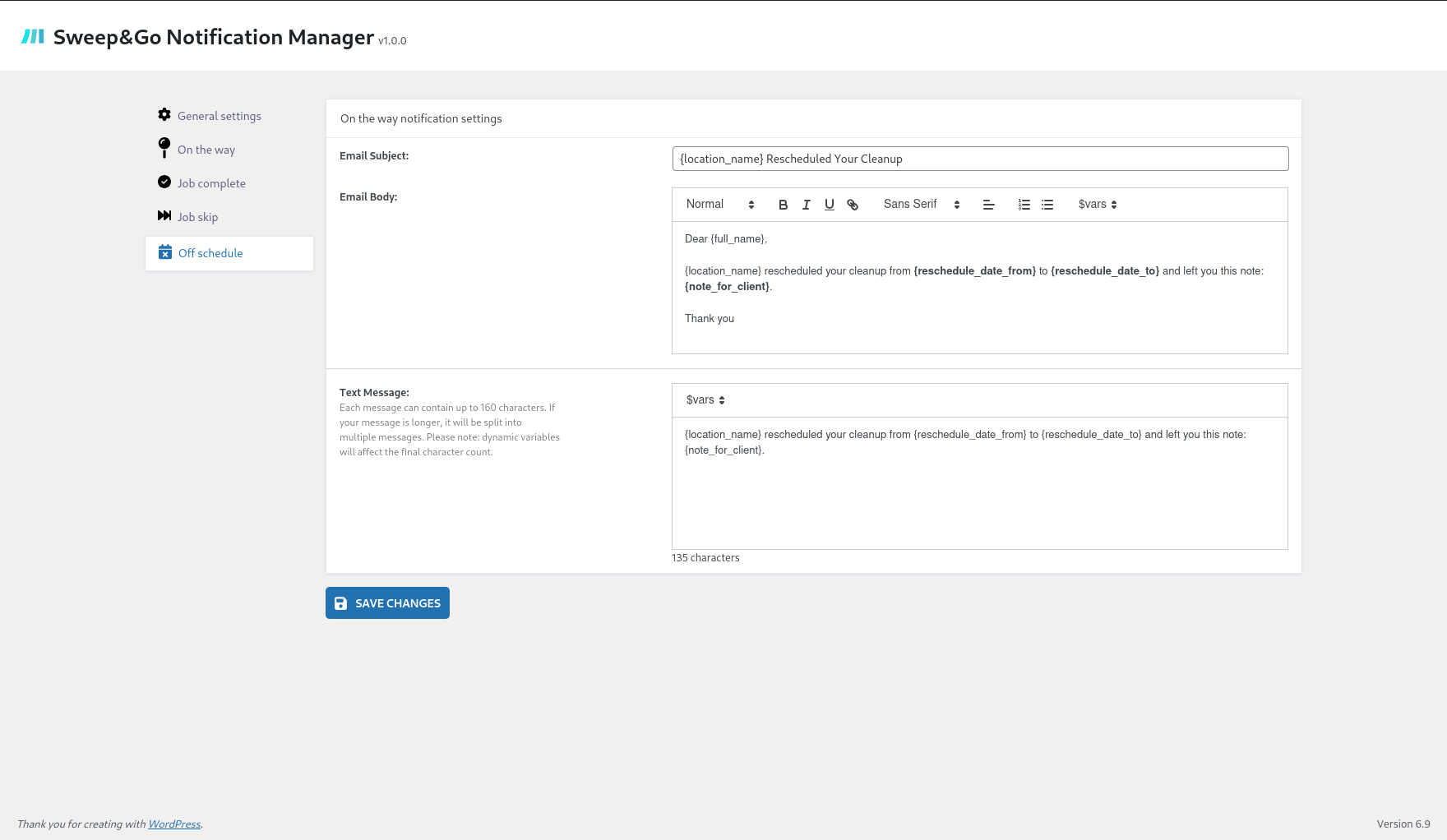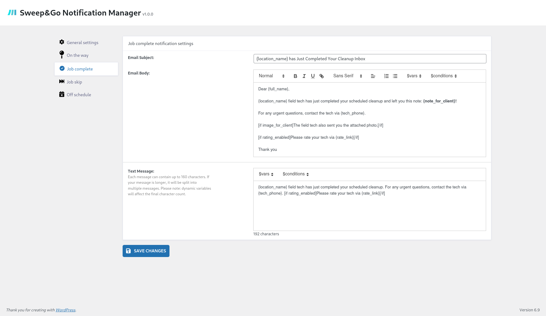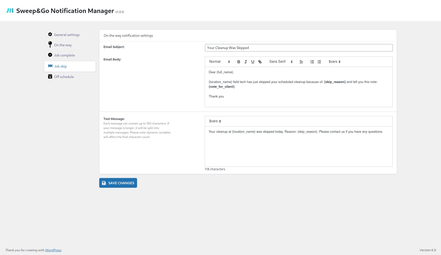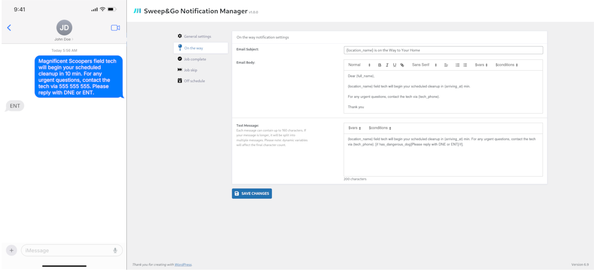 SNG Notification Manager is a WordPress plugin built exclusively for Sweep&Go users to notify clients about changes in the status of their scheduled cleaning appointments. The plugin allows you to fully personalize all Sweep&Go notification types, including On the Way, Job Complete, Job Skipped, and Off Schedule messages.